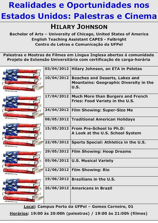 Realidades e Oportunidades nos EUA: Palestras e Cinema Veja detalhes na notícia, na Agenda. Compartilhe: Clique para compartilhar no Facebook(abre em nova janela) Facebook Clique para compartilhar no X(abre em nova janela) 18+ Clique para enviar um link por e-mail para um amigo(abre em nova janela) E-mail Publicado em 26/03/2012