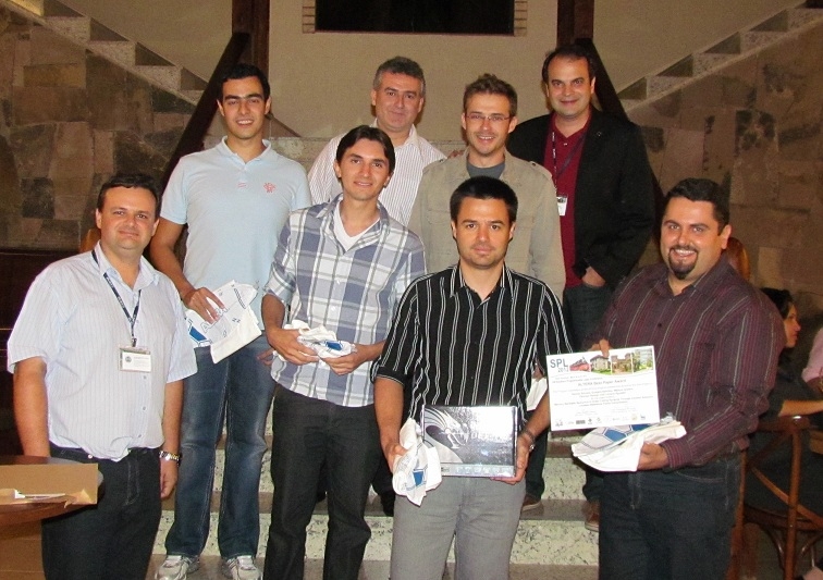 Na foto estão os cinco autores do artigo premiados, o prof. César Zeferino (UNIVALI) – Coordenador de Programa do SPL 2012, o prof. Júlio Mattos (UFPel) – Coordenador Local do SPL 2012 e o Eng. Fábio Petrassen da DHW Engenharia (representante Altera no Brasil).