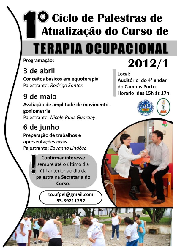O curso de Terapia Ocupacional está realizando seu 1º Ciclo de Palestras de Atualização, que ocorre de 3 de abril a 6 de junho. Clique no cartaz no começo do texto para conferir as informações.