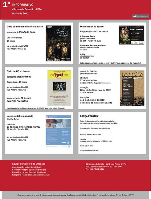 Informativo Câmara de Extensão da UFPel Compartilhe: Clique para compartilhar no Facebook(abre em nova janela) Facebook Clique para compartilhar no X(abre em nova janela) 18+ Clique para enviar um link por e-mail para um amigo(abre em nova janela) E-mail Publicado em 29/03/2012
