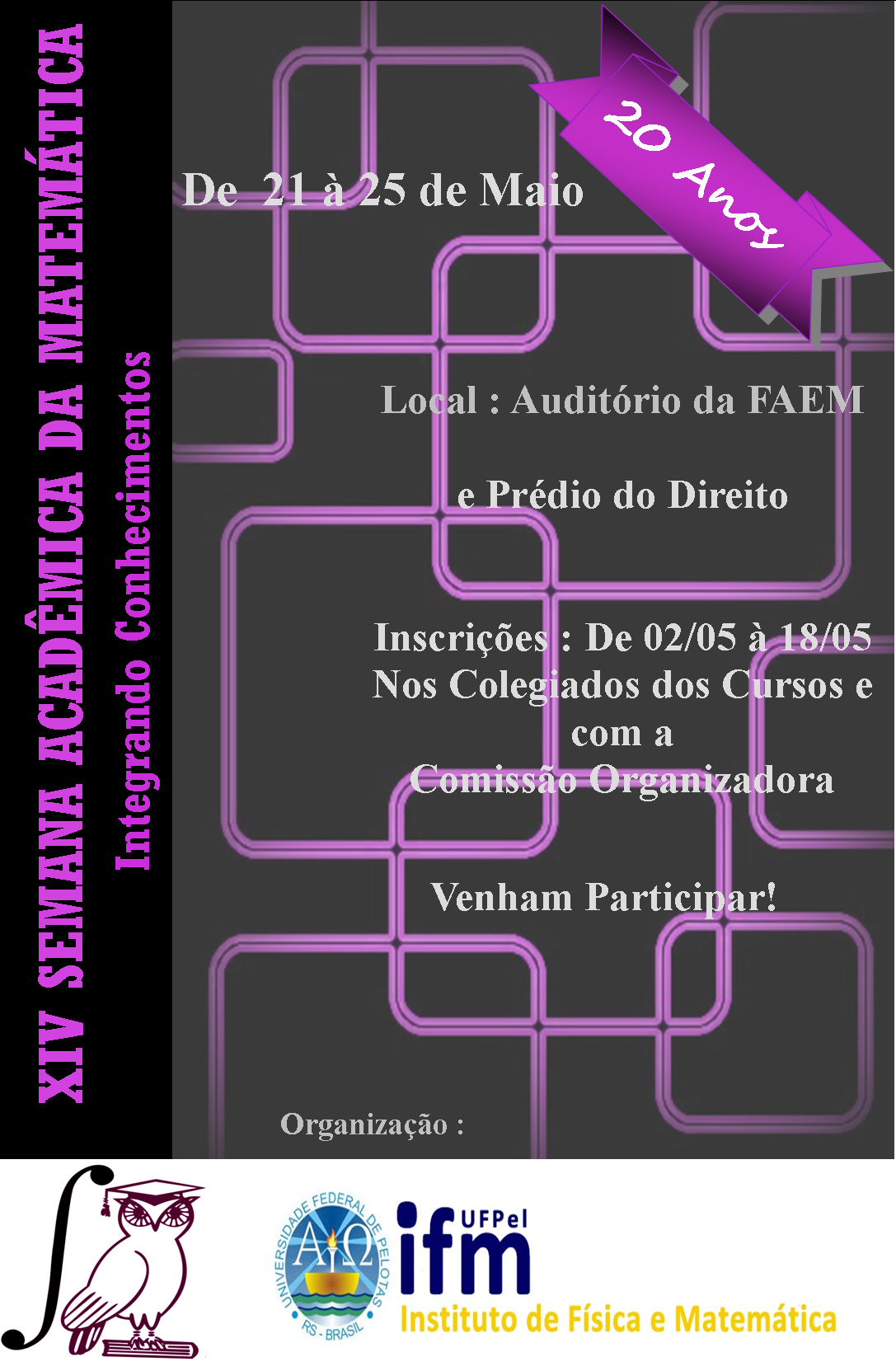Inscrições e mais informações nos Colegiados dos Cursos de Física e Matemática, até 18 de maio, no Prédio 5 do Campus Capão do Leão (diurno) ou à rua Andrade Neves, 1561.
