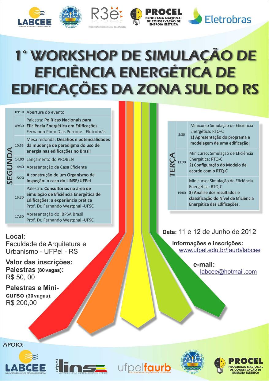 O Laboratório de Conforto e Eficiência Energética(Labcee) da Faculdade de Arquitetura e Urbanismo da UFPel realiza, dias 11 e 12 de junho, naquela unidade de ensino, o I Workshop de Simulação de Eficiência Energética de Edificações da Zona Sul do RS. Confira a programação clicando na imagem no começo do texto. Mais informações e inscrições no endereço www.ufpel.edu.br/faurb/labcee.