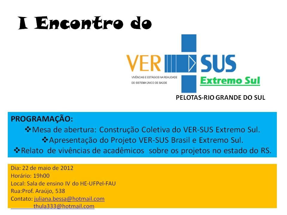 O Projeto VER-SUS Brasil (vivências e estágios na realidade do Sistema Único de Saúde) tem apoio do Ministério da Saúde e é desenvolvido por um coletivo de estudantes da UFPel. A sua finalidade é realizar um estágio de vivência de aproximadamente 15 dias, imerso na realidade do sistema de saúde brasileiro em diversos municípios da região sul do estado.