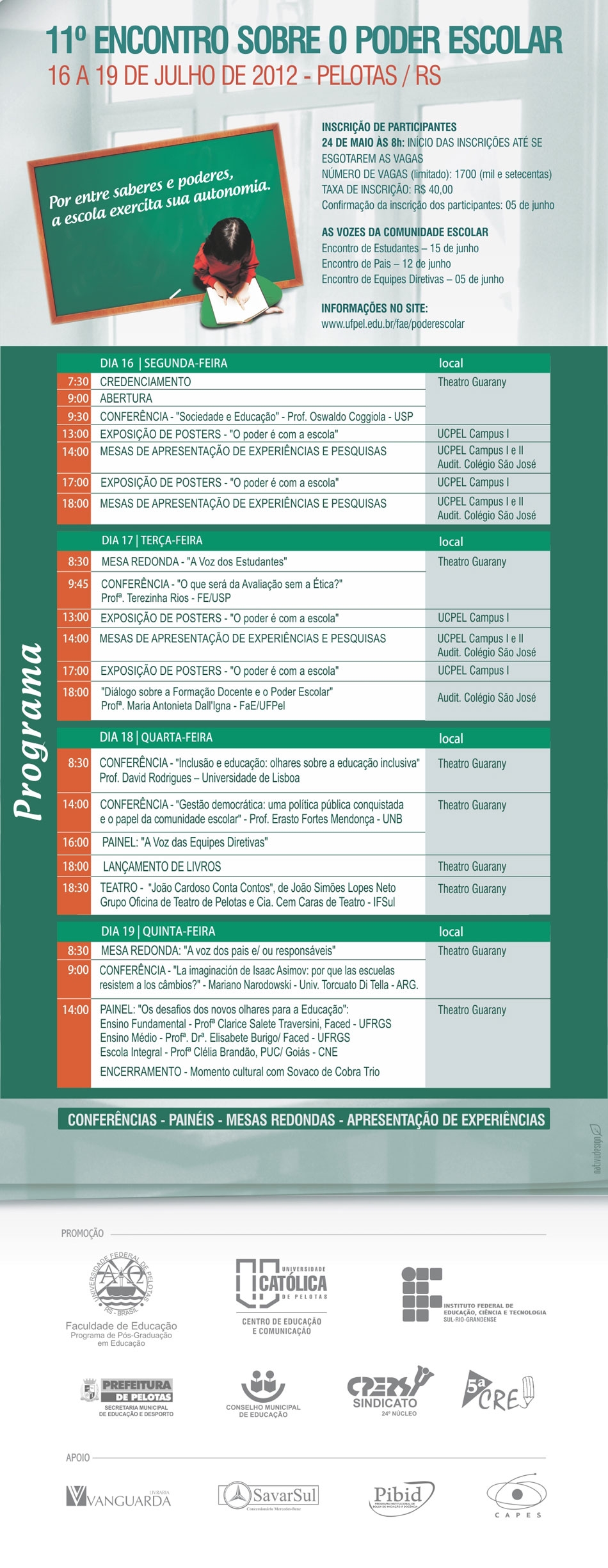 11° Encontro sobre o Poder Escolar Compartilhe: Clique para compartilhar no Facebook(abre em nova janela) Facebook Clique para compartilhar no X(abre em nova janela) 18+ Clique para enviar um link por e-mail para um amigo(abre em nova janela) E-mail Publicado em 22/05/2012