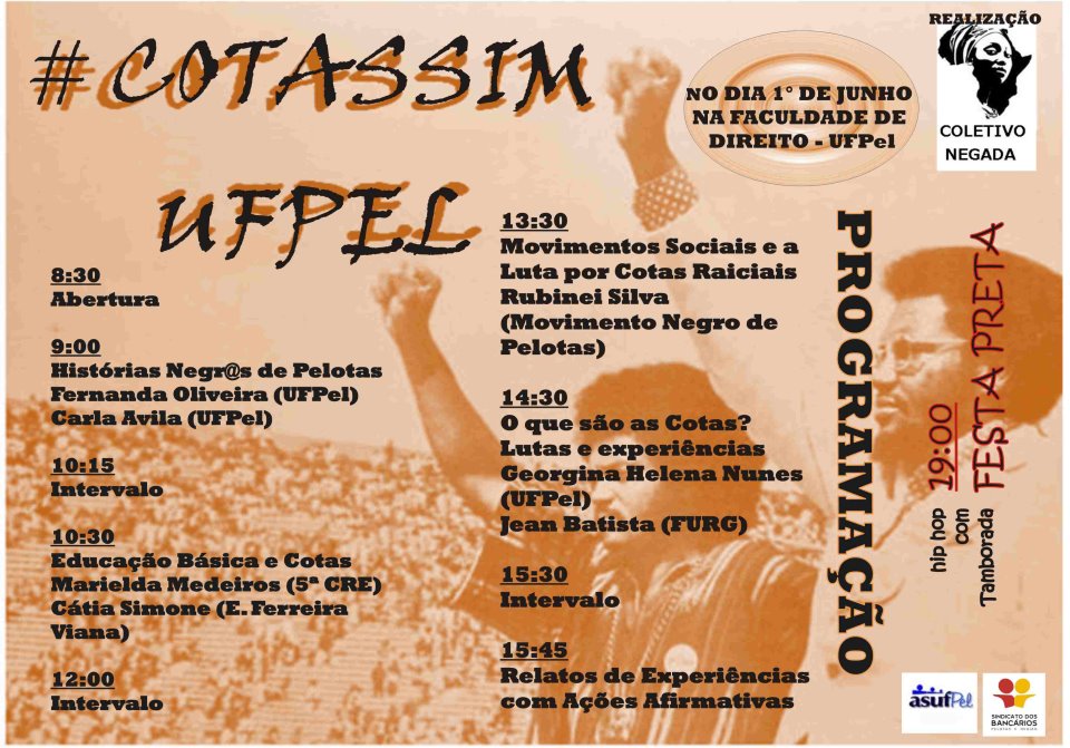 O Seminário Cotassim discutirá os movimentos sociais e a luta por cotas raciais. O evento ocorre no dia 1º de junho, na Faculdade de Direito da UFPel.