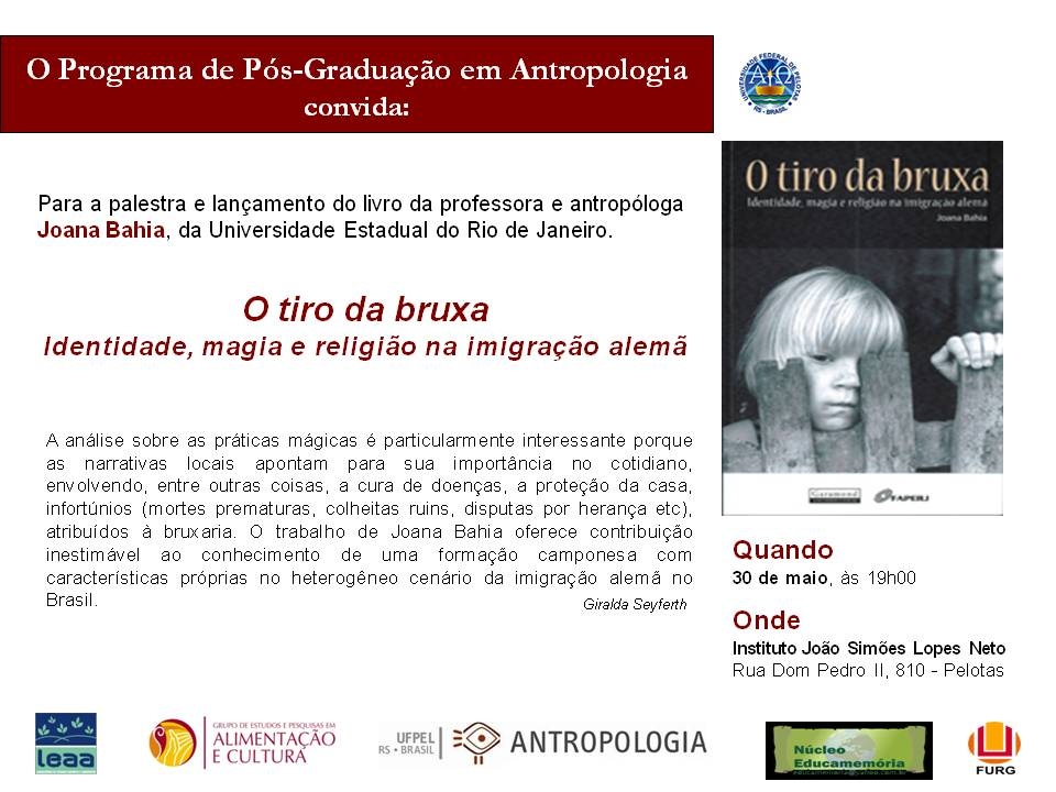 A professora e antropóloga Joana Bahia, da Universidade Estadual do Rio de Janeiro profere palestra nesta quarta-feira(30) no Programa de Pós-Graduação em Antropologia da UFPel. O evento será às 19h, no Instituto João Simões Lopes Neto (rua Dom Pedro II, 810). A palestra tem como tema “O tiro da bruxa: Identidade, magia e religião na imigração alemã”.
