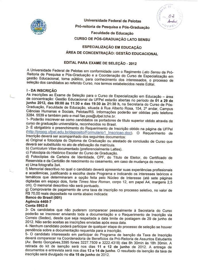 O Curso de Especialização em Gestão Educacional está publicando edital com as instruções para o processo seletivo do referido curso. As inscrições estarão abertas no período de 01 a 29 de junho, das 9h às 11h30min e das 19h30min às 21h30min na Secretaria do Curso de Pós-Graduação da Faculdade de Educação, situada à rua Alberto Rosa, 154, 2º andar, Campus Ciências Humanas e Sociais.