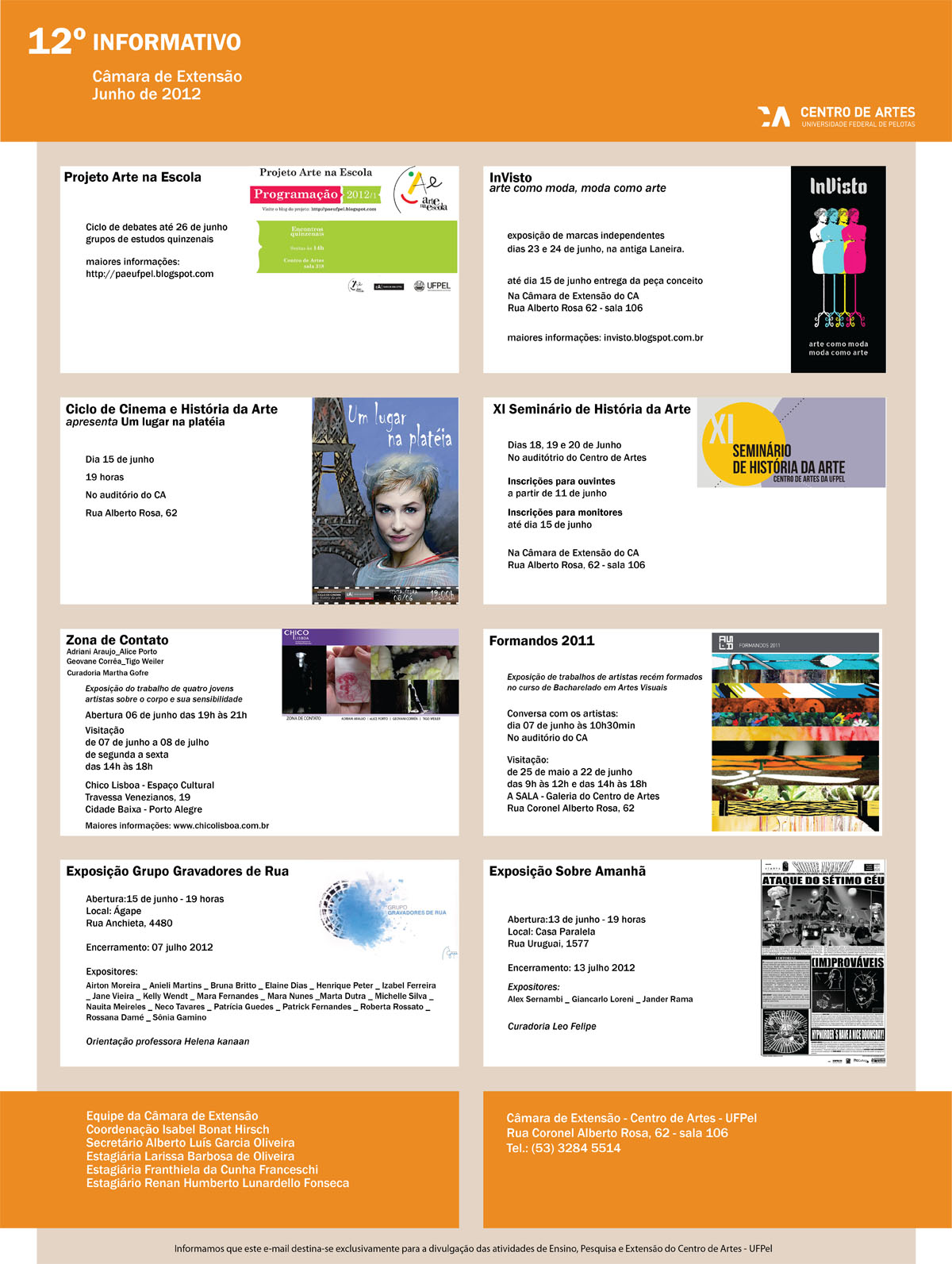 Câmara de Extensão do Centro de Artes publica nova edição do InformativoClique para ler. Compartilhe: Clique para compartilhar no Facebook(abre em nova janela) Facebook Clique para compartilhar no X(abre em nova janela) 18+ Clique para enviar um link por e-mail para um amigo(abre em nova janela) E-mail Publicado em 13/06/2012