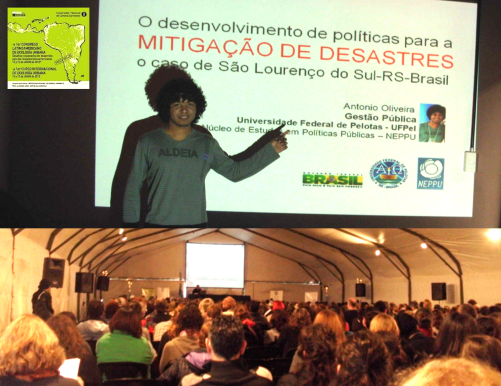 O acadêmico do Curso de Gestão Pública da Faculdade de Administração e Turismo da Universidade Federal de Pelotas FAT/UFPel e membro no Núcleo de Estudos em Políticas Públicas – NEPPU, Antonio Oliveira da Silva, apresentou o trabalho intitulado: “O Desenvolvmento de Políticas para a Mitigação de Desastres: O caso de São Lourenço do Sul-RS-Brasil” no Iº Congresso Latino-americano de Ecologia Urbana, que foi realisado em Buenos Aires – Argentina, nos dias 12 e 13 de junho.