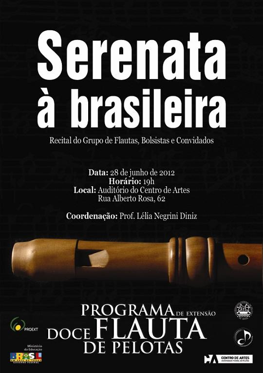 Será realizado na próxima quinta-feira, dia 28 de junho, às 19h, no Auditório do Centro de Artes (rua Alberto Rosa, 62), Recital do Grupo de Flautas, Bolsistas e Convidados. O espetáculo denominado Serenata à brasileira tem a coordenação da professora Lélia Negrini Diniz.
