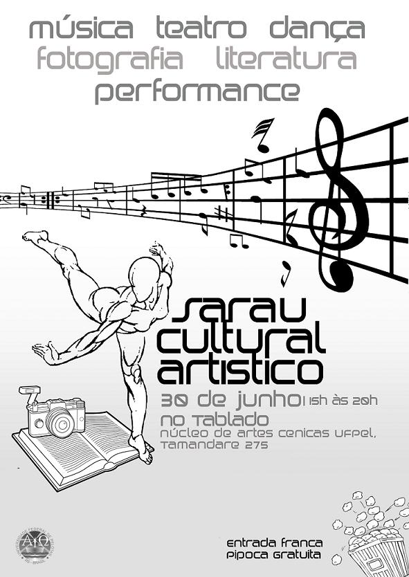 Neste sábado(30), das 15h às 20h, será realizado, no Núcleo de Artes Cênicas do Tablado – UFPel, na rua Tamandaré nº 275, Sarau Artístico Cultural, organizado pelos novos produtores culturais do curso de Artes Visuais da UFPel e coordenado pela professora Juliana Angeli.