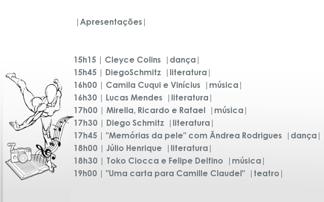 No evento irão ocorrer apresentações de diferentes âmbitos artísticos, como dança, teatro, literatura e música. E simultaneamente a todos os espetáculos estará ocorrendo uma mostra fotográfica. A ideia de unir trabalhos artísticos de distintas áreas visa sensibilizar o público através de diferentes percepções, como a dança, com os movimentos corporais; a música, que através dos diferentes ritmos induz a atividade cerebral ligada ao emocional ; e a fotografia, que trabalha com a memória e percepção visual.