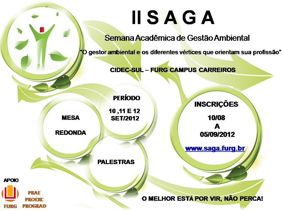 Evidenciando essa peculiaridade, os discentes do 3º semestre do referido curso, estarão realizando no período de 10 a 12 de setembro, a SEGUNDA SEMANA ACADÊMICA DE GESTÃO AMBIENTAL – II SAGA.