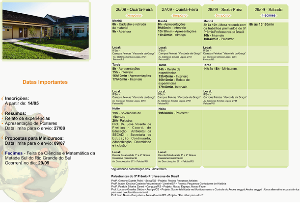 As inscrições do Minicurso do 8º Simpósio de Professores de Ciências e Matemática estão encerradas. Ainda estão abertas as inscrições de resumos (relato de experiências e pôster). Para as inscrições, não é permitido depósito via envelope ou transferência bancária, apenas Depósito Simples. Acesse o site do evento para maiores informações: necim.cavg.ifsul.edu.br Blog – necimsimposio.wordpress.com Data do evento: 26 a 29 de setembro Local: Escola Estadual de 1º e 2º graus Cassiano do Nascimento (Av. Dom Joaquim, 671 – Pelotas/RS)