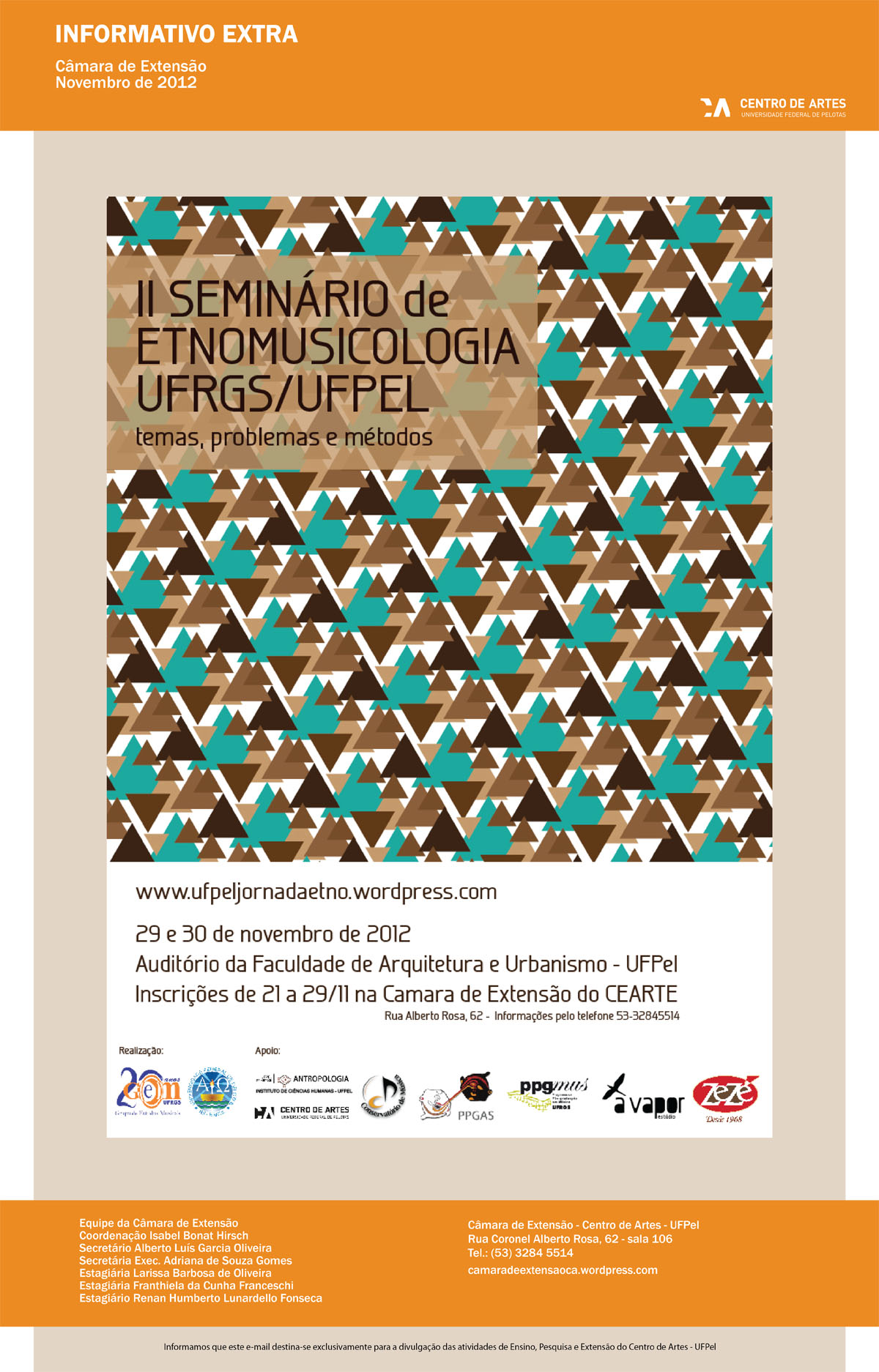 Câmara de Extensão do Centro de Artes publica Informativo Extra e Errata Compartilhe: Clique para compartilhar no Facebook(abre em nova janela) Facebook Clique para compartilhar no X(abre em nova janela) 18+ Clique para enviar um link por e-mail para um amigo(abre em nova janela) E-mail Publicado em 23/11/2012