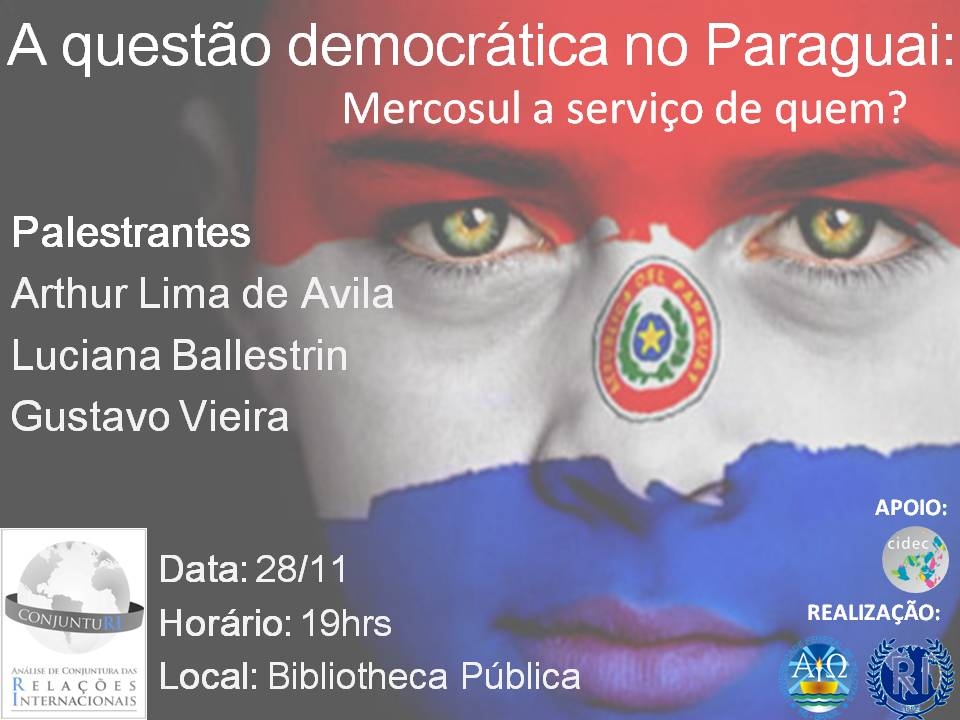 O tema desta edição será ‘A questão democrática no Paraguai: Mercosul a serviço de quem?’. Estarão palestrando os professores Arthur Lima de Avila, doutor em História pela UFRGS e professor no departamento de História da UFPel; Gustavo Oliveira Vieira, mestre em Direito pela UNISC e professor do curso de Relações Internacionais da UFPel; e Luciana Ballestrin, doutora em Ciência Política pela UFMG e professora do curso de Relações Internacionais da UFPel.