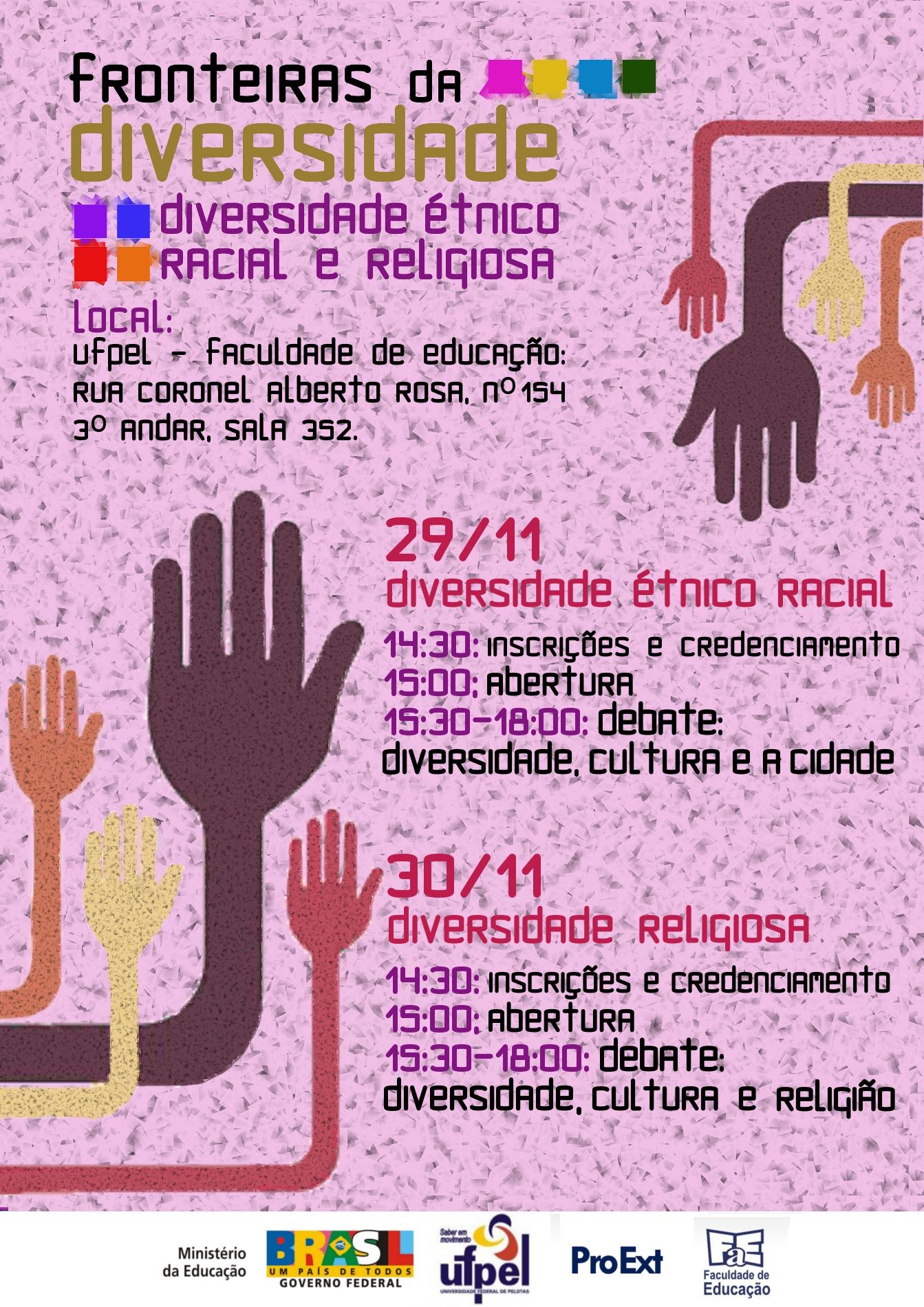 Nesta quinta(29) e sexta-feira(30), o Programa de Extensão da Universidade Federal de Pelotas “Fronteiras da Diversidade” propõe debates acerca da Diversidade Étnico, Racial e Religiosa. O evento terá inicio às 14h30min, para a realização das inscrições, na FAE – Faculdade de Educação da UFPel, na rua Coronel Alberto Rosa, 154, 3ºandar, sala 352, Porto.