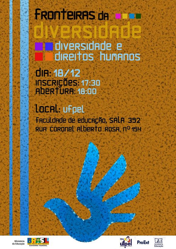 O grupo Fronteiras da Diversidade, do Núcleo de Arte, Linguagem e Subjetividade (NALS), da Faculdade de Educação (FAE/UFPel), convida a todos para mais um encontro-debate de conhecimentos políticos e de cidadania. Em discussão, na terça-feira (18), vivências de diversos lutadores a partir de sua perspectiva de opressão de gênero, assassinatos no campo, diálogo universidade-sociedade, sindicalismo, entre outros.