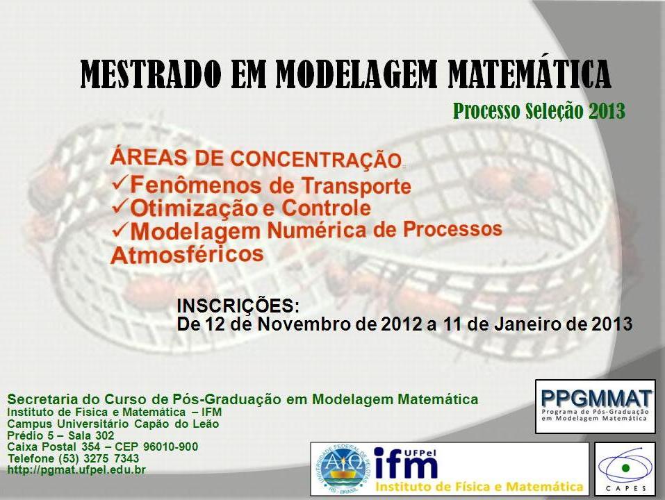 Encontram-se abertas, até 11 de janeiro, as inscrições para o Exame de Seleção para o Curso de Mestrado em Modelagem Matemática da UFPel. Clique na imagem para mais informações.