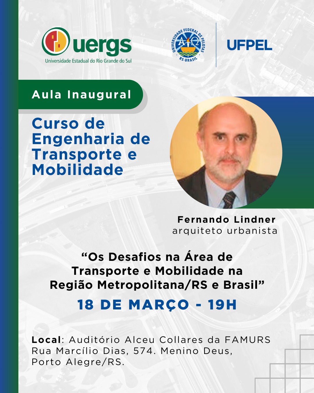 O curso de graduação em Engenharia de Transporte e Mobilidade, oferecido em conjunto pela Universidades Federal de Pelotas (UFPel) e Estadual do Rio Grande do Sul (Uergs), realizará a sua aula inaugural na terça-feira (18), às 19h. Na ocasião, o arquiteto e urbanista Fernando Lindner debaterá sobre os desafios da área de Transporte e Mobilidade na Região Metropolitana do Rio Grande do Sul e no Brasil. A atividade será na sede da Federação das Associações de Municípios do Rio Grande do Sul (Famurs), auditório Alceu Collares, localizado à rua Marcílio Dias, 574, em Porto Alegre.