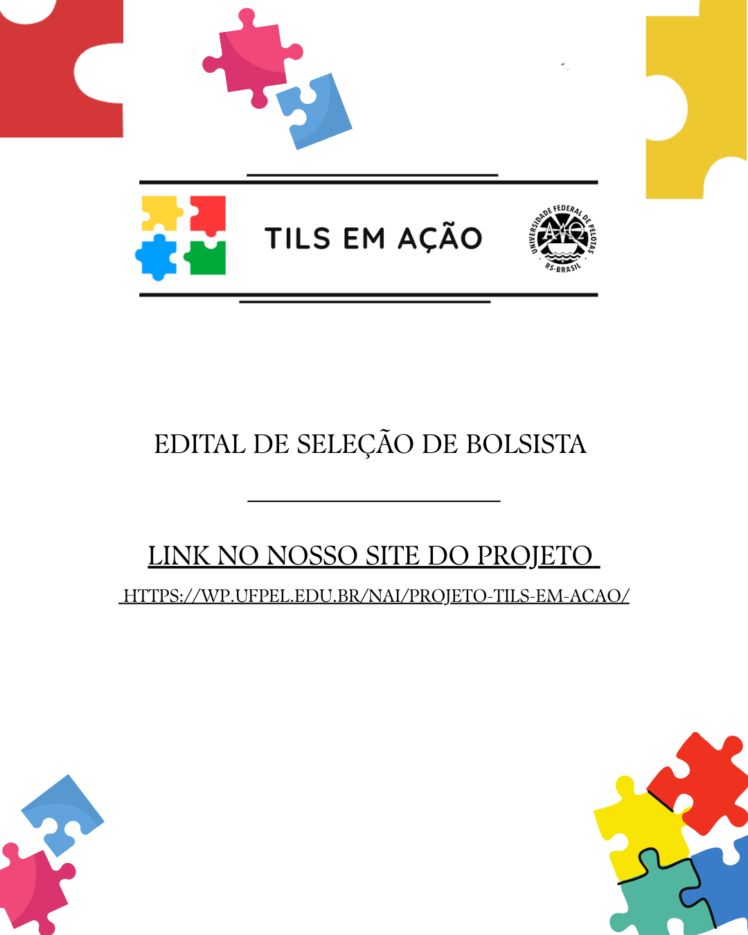 O projeto de extensão TILS (Tradução e Interpretação de Libras) em Ação, da Universidade Federal de Pelotas (UFPel), abriu inscrições para seleção de um bolsista. Podem candidatar-se estudantes regularmente matriculados nos cursos de graduação da UFPel e que disponham de 20 horas semanais para atuar presencialmente no projeto.