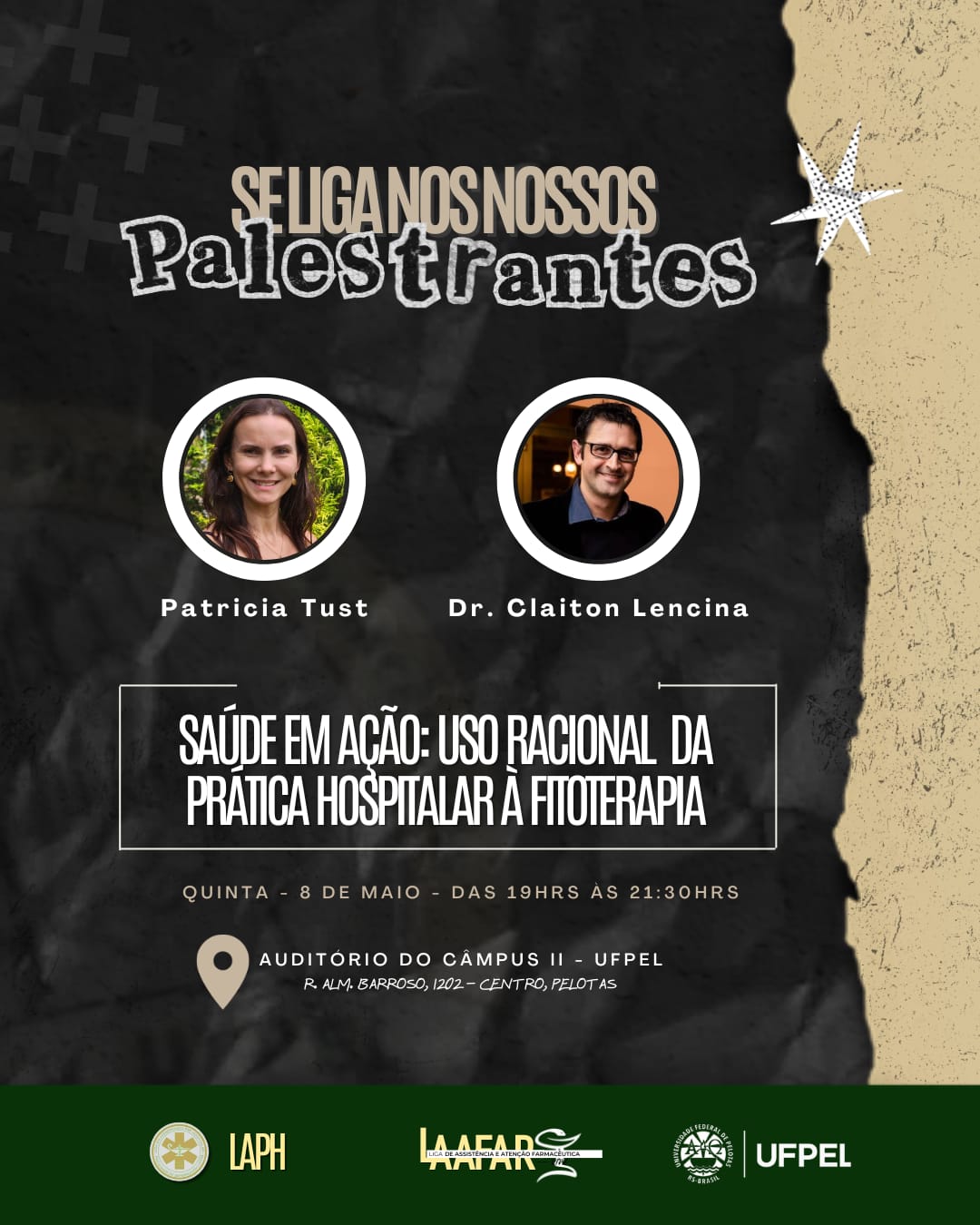 Por fim, na quinta-feira (8), das 19h às 21h30, o projeto promoverá palestras sobre uso racional de medicamentos em âmbito hospitalar e na fitoterapia, por de Patricia Tust e Claiton Lencina, no auditório do “câmpus 2” (rua Almirante Barroso, 1202). As inscrições estão disponíveis por formulário eletrônico. Mais informações estão disponíveis no perfil do projeto no Instagram (@laafarufpel).