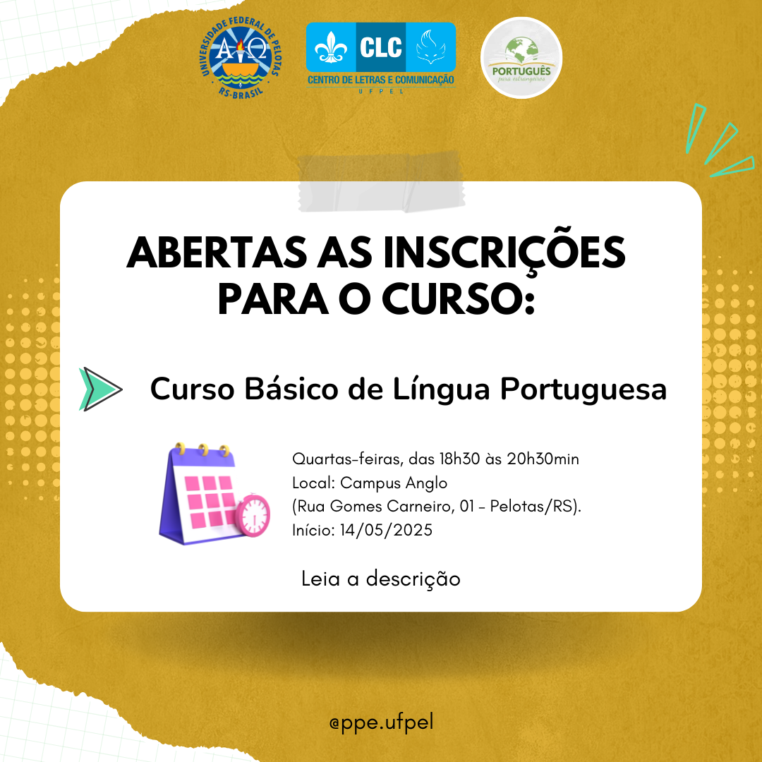 O Programa Português para Estrangeiros da Universidade Federal de Pelotas (PPE/UFPel) abriu inscrições para dois cursos voltados a estrangeiros: “Curso Básico de Língua Portuguesa” e “Curso Preparatório Exame Celpe-Bras”.