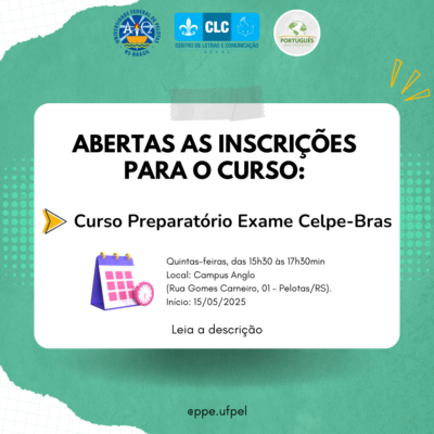 O Curso Preparatório Exame Celpe-Bras terá encontros às quintas-feiras, das 15h30min às 17h30min, com início no dia 15 de maio. O Celpe-Bras é o exame para obtenção do Certificado de Proficiência em Língua Portuguesa para Estrangeiros. O formulário para inscrição pode ser acessado neste link.