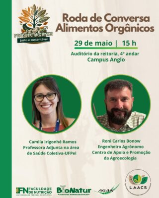 A Faculdade de Nutrição da UFPel realizará programação alusiva à 21ª Semana do Alimento Orgânico. Com promoção da Liga Acadêmica de Alimentação Coletiva e Sustentabilidade (LAACS) e parceria do Núcleo Regional da Associação Gaúcha de Nutrição (Agan), ocorrerá a roda de conversa “Alimentos orgânicos”.