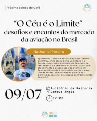 Ocorrerá no dia 9 de julho a 39ª edição do evento Café com Turismo, promovido pelo curso de Turismo da UFPel. Desta vez, o tema a ser explorado será “O céu é o limite: Desafios e encantos do mercado da aviação no Brasil”. A atividade será presencial e ocorrerá às 17h no Auditório da Reitoria, localizado no quarto andar do Campus Anglo.