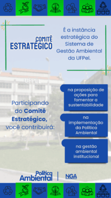 O Sistema de Gestão Ambiental receberá inscrições para a composição do Comitê Estratégico, conforme a Política Ambiental da Universidade Federal de Pelotas (UFPel), até 6 de junho. Serão eleitas representações das unidades acadêmicas dos câmpus Capão do Leão e Pelotas, da categoria docentes, técnico-administrativa e de estudantes (titular e suplência). As candidaturas devem ser apresentadas por formulário eletrônico. O Comitê Estratégico, dentre outros instâncias do Sistema de Gestão Ambiental, é responsável por “orientar procedimentos institucionais quanto à dimensão ambiental e garantir a implementação da Política […]