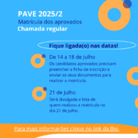 A Coordenação de Registros Acadêmicos (CRA) da Universidade Federal de Pelotas (UFPel) publicou na sexta-feira (11) a convocação para solicitação de matrícula das e dos candidatos aprovados do Programa de Avaliação da Vida Escolar (Pave), para ingresso no segundo semestre letivo de 2025. Quem estiver na lista da chamada regular deverá enviar a´té 18 de julho, via Sistema Cobalto, a ficha de inscrição (on-line) e a documentação exigida. O Pave consiste num processo seletivo seriado, alternativo, para ingresso nos cursos de graduação da Instituição. São […]