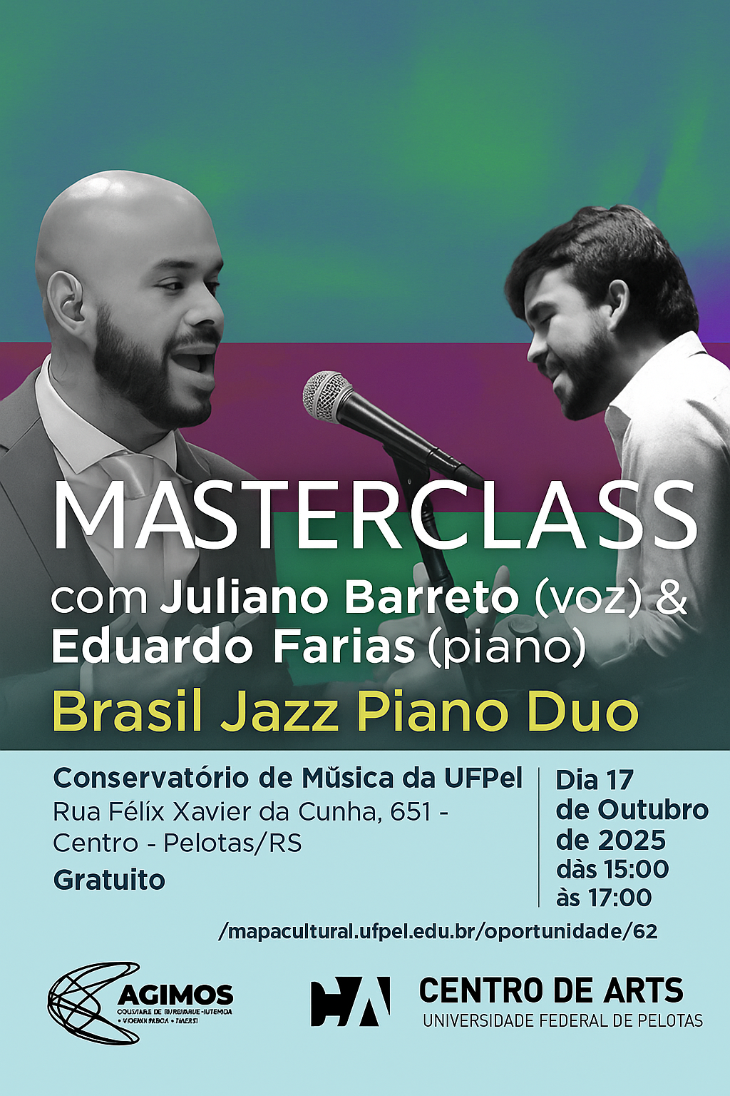 O Conservatório de Música da Universidade Federal de Pelotas (UFPel) promove uma masterclass gratuita com o Brasil Jazz Piano Duo, formado por Juliano Barreto (voz) e Eduardo Farias (piano). O encontro será realizado no Salão Milton de Lemos, e as inscrições podem ser feitas pelo Mapa Cultural da UFPel. Em turnê rumo a Montevidéu, o duo faz uma parada especial em Pelotas para compartilhar suas experiências artísticas e técnicas. A atividade propõe uma imersão nos aspectos técnicos, emocionais e estratégicos da performance musical, com demonstrações […]