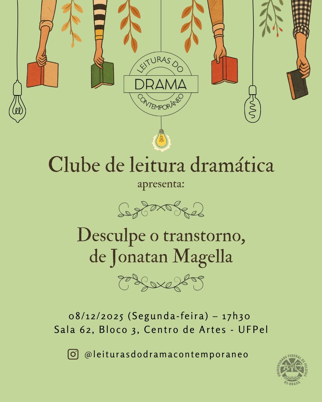 O Clube de Leitura Dramática da Universidade Federal de Pelotas (UFPel) apresentará na segunda-feira (8) a leitura do texto teatral “Desculpe o transtorno”, do dramaturgo Jonatan Magella. A atividade, que integra o projeto “Leituras do Drama Contemporâneo“, será realizada no Centro de Artes (rua Alberto Rosa, 117), na sala 62 (Bloco três). A entrada é gratuita e aberta à comunidade em geral.