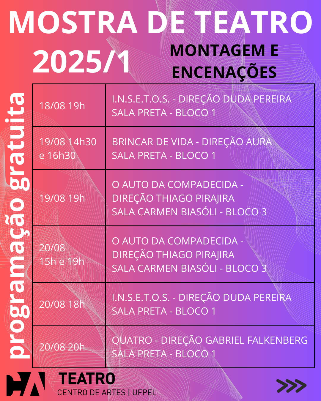 De 18 a 29 de agosto o curso de Teatro – Licenciatura da Universidade Federal de Pelotas (UFPel) promove a Mostra de Teatro 2025/1. A programação conta com 23 apresentações gratuitas de espetáculos teatrais, realizadas nos Blocos 1 e 3 do Centro de Artes da UFPel. A mostra faz parte do Projeto de Extensão Mostras de Teatro UFPel e apresenta os espetáculos criados nas disciplinas de Montagem teatral I, que tem a direção do professor Thiago Pirajira; de Encenação Teatral I, orientados pela professora Yaska […]
