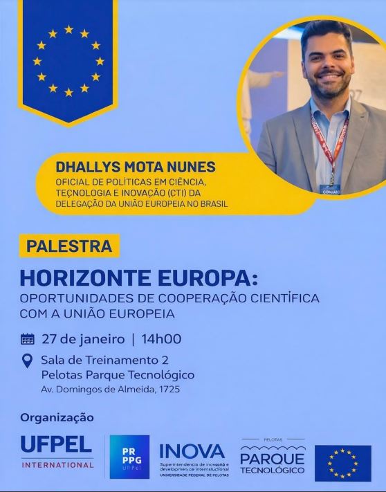 Com organização da Universidade Federal de Pelotas (UFPel), palestra a ser realizada na terça-feira (27), às 14h, abordará as oportunidades de cooperação científica com a União Europeia. A atividade “Horizonte Europa” será ministrada pelo oficial de Políticas em Ciência, Tecnologia e Inovação da União Europeia no Brasil Dhallys Nunes, no auditório do Pelotas Parque Tecnológico (avenida Domingos de Almeida, 1785).