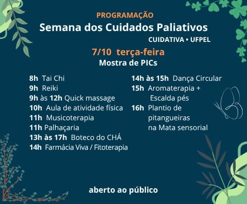 A Unidade Cuidativa da Universidade Federal de Pelotas (UFPel), Centro Regional de Referência em Cuidados Paliativos, realiza diversas atividades alusivas à Semana dos Cuidados Paliativos. Nesta terça-feira (07), haverá ações de Práticas Integrativas e Complementares em Saúde (PICS), abertas ao público. A Cuidativa fica na Avenida Duque de Caxias, 104. No dia 08 de outubro, às 14h, haverá uma live no Canal da Cuidativa no YouTube, sobre o protagonismo dos serviços pioneiros na implementação das primeiras equipes de cuidados paliativos habilitadas pela Política Nacional de […]