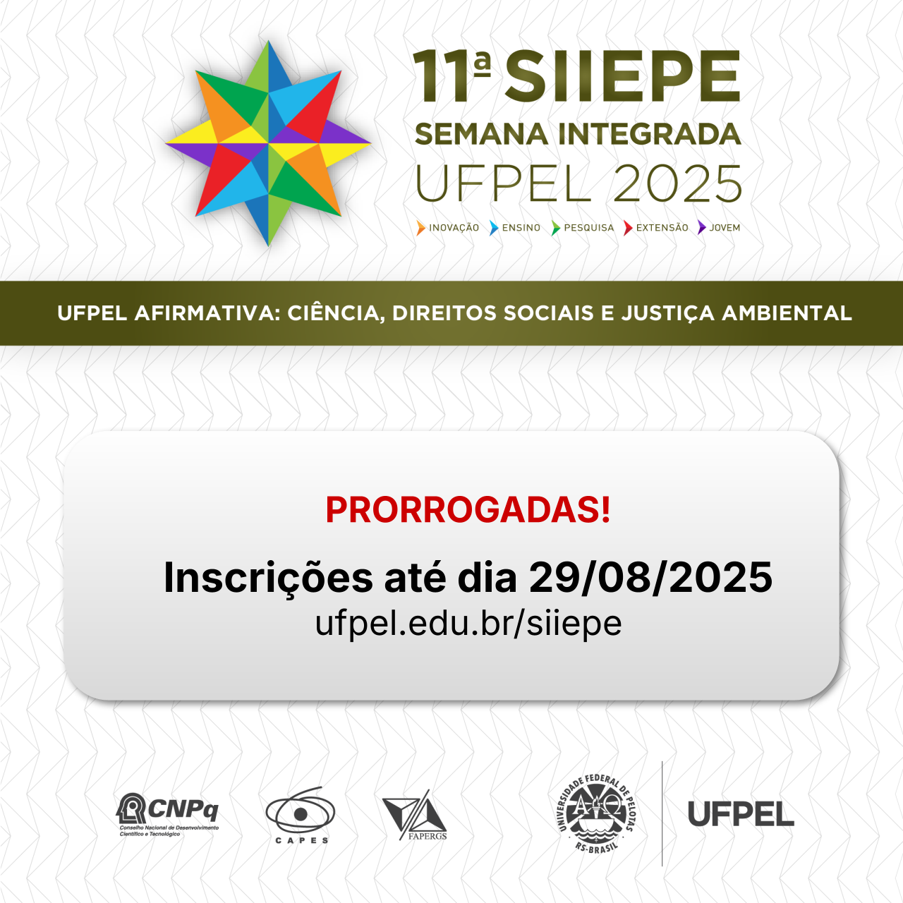A SIIEPE Jovem é uma das novidades da 11ª Semana Integrada de Inovação, Ensino, Pesquisa e Extensão da Universidade Federal de Pelotas (SIIEPE/UFPel) deste ano. O evento foi criado para valorizar trabalhos protagonizados por estudantes do Ensino Médio, fortalecendo o vínculo entre a Universidade e as escolas da região. A Semana Integrada ocorre de 20 a 24 de outubro. A iniciativa surgiu a partir das bolsas de Iniciação Científica para estudantes do Ensino Médio, criadas pela Pró-Reitoria de Pesquisa e Pós-Graduação (PRPPG), que permitem o […]